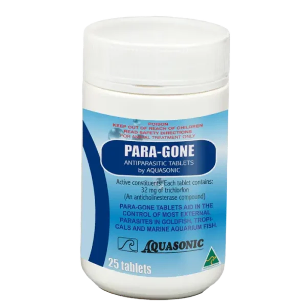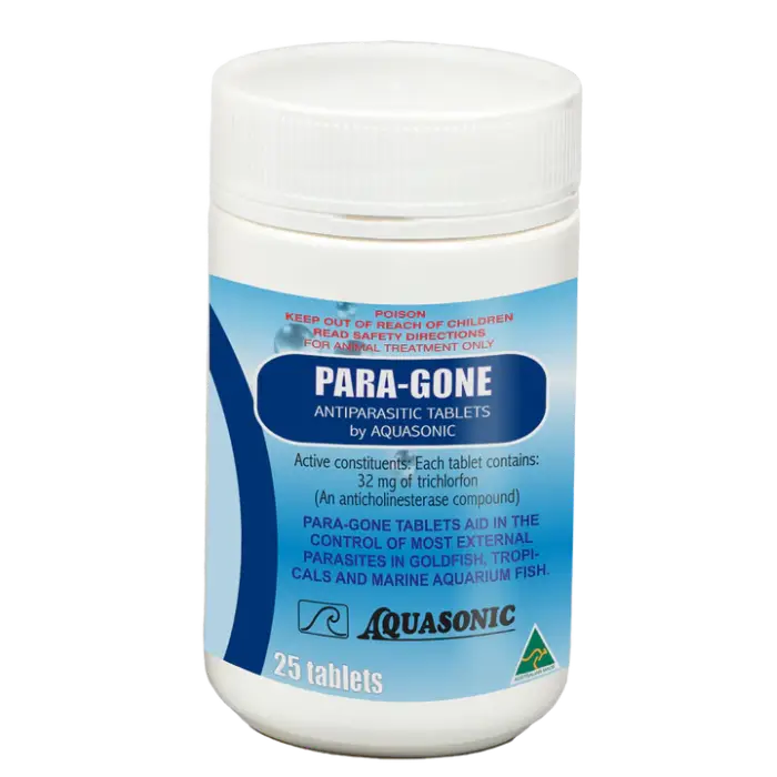 Aquasonic Para-Gone 25 Tablets help control most external parasites in goldfish, tropical and marine aquarium fish, including fish lice, gill flukes and anchor worms, making it a goโto treatment when fish are rubbing or scratching on dรฉcor.