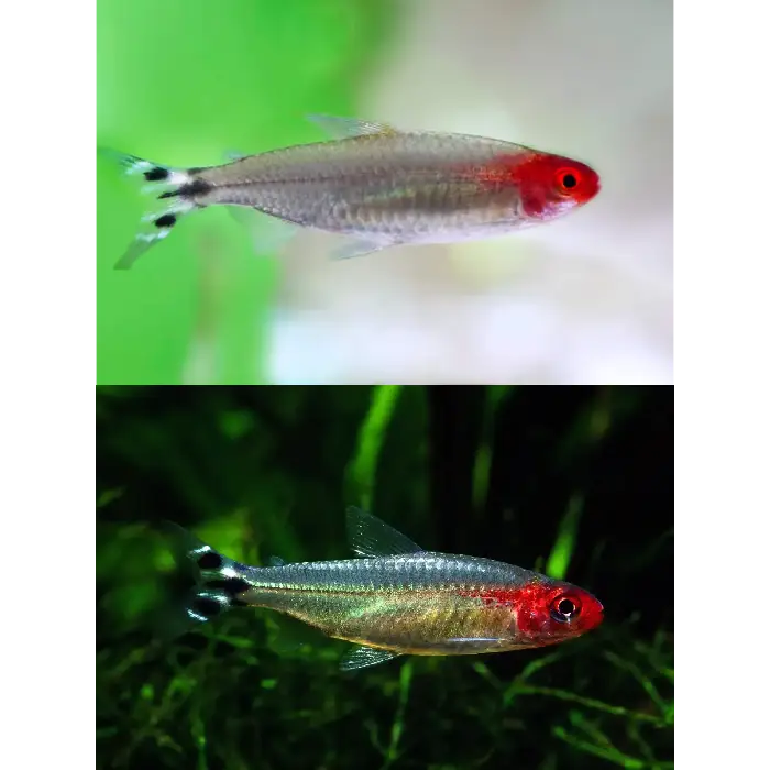 Brilliant Rummy Nose 3cm (Hemigrammus bleheri) is a striking schooling tetra known for its vivid red nose and bold blackโandโwhite tail pattern. At around 3cm, Brilliant Rummy Nose 3cm are perfect for planted community tanks, where their tight schooling behaviour and colour make them a standout midโwater feature.