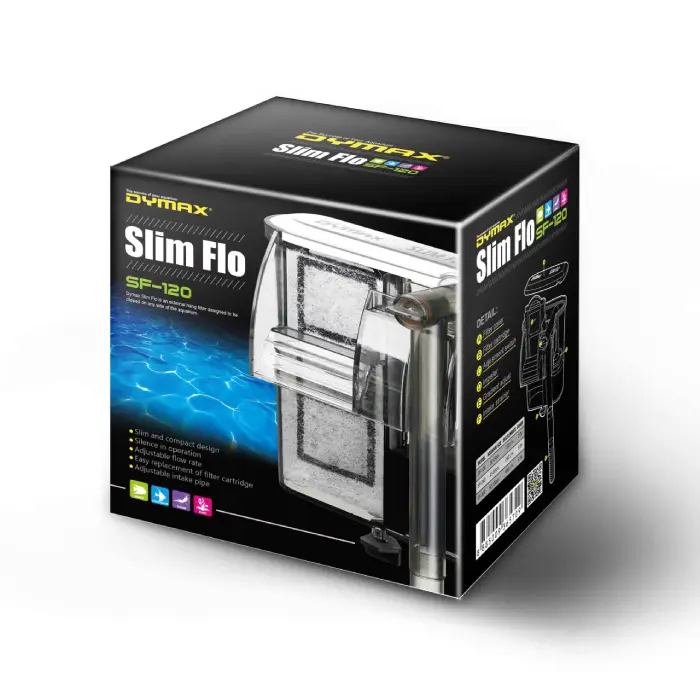 DYMAX Slim Flo SF-120 is a compact external hangโon filter that clips to the side of your aquarium, saving space inside the tank. DYMAX Slim Flo SF-120 delivers 120L/H of quiet, adjustable flow with cascading waterfall filtration, an extendable intake pipe and easyโchange cartridges, ideal for 30โ45cm aquariums.