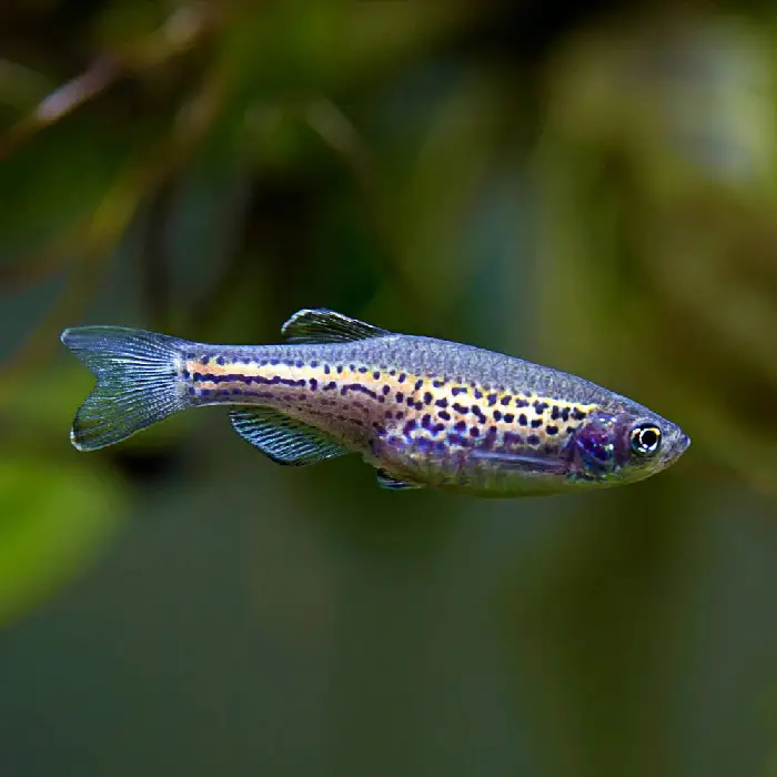 The Leopard Danio (3-3.5 cm) is a striking spotted variant of the zebra danio, admired for its shimmering gold or silver body covered in bold, irregular dark spots. Its active behaviour makes it a delight to watch—it zooms through the middle to top levels of the aquarium, bringing constant life and motion.