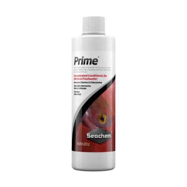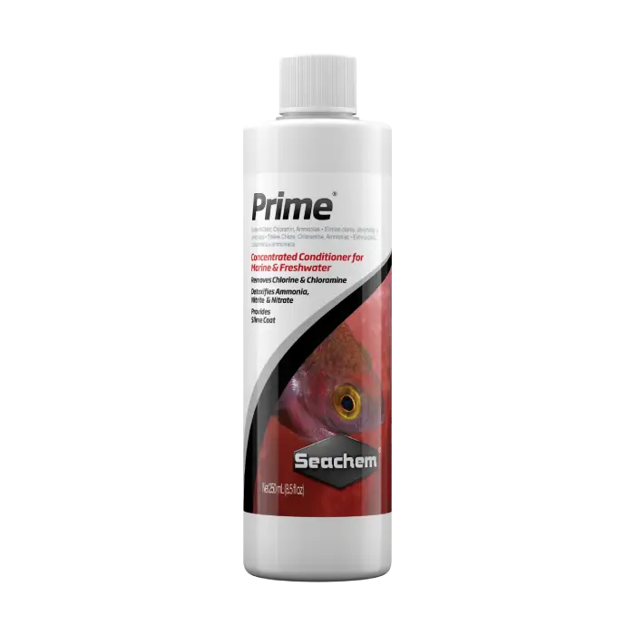 Nearly all pet aquatics companies manufacture a product that removes chlorine. None of those, however, can compare in quality, concentration, or effectiveness to Seachemโs flagship product: Primeยฎ. Primeยฎ is the complete and concentrated conditioner for both fresh and saltwater. Primeยฎ removes chlorine, chloramine and detoxifies ammonia, nitrite, and nitrate.ย It is non-acidic and will not impact pH. A further bonus for the reef hobbyistโPrimeยฎ will not over-activate skimmers.