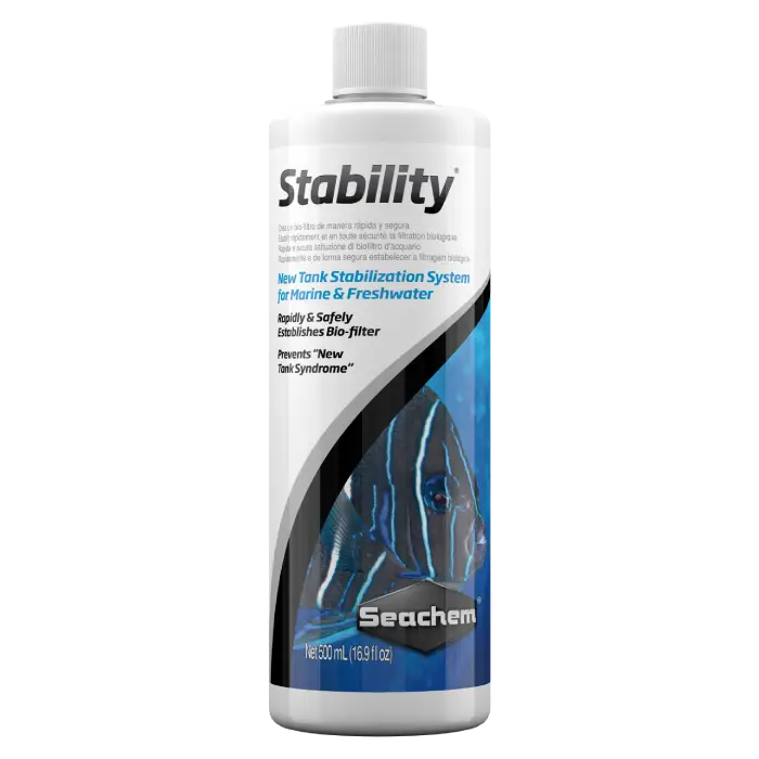 Stability® will rapidly and safely establish the aquarium biofilter in freshwater and marine systems, thereby preventing the #1 cause of fish death: “new tank syndrome”. Stability® is formulated specifically for the aquarium and contains a synergistic blend of aerobic, anaerobic, and facultative bacteria which facilitate the breakdown of waste organics, ammonia, nitrite, and nitrate. The bacteria employed by Stability® are non-sulfur fixing and will not produce toxic hydrogen sulfide. Stability® is completely harmless to all aquatic organisms as well as aquatic plants, thus there is no danger of over use.